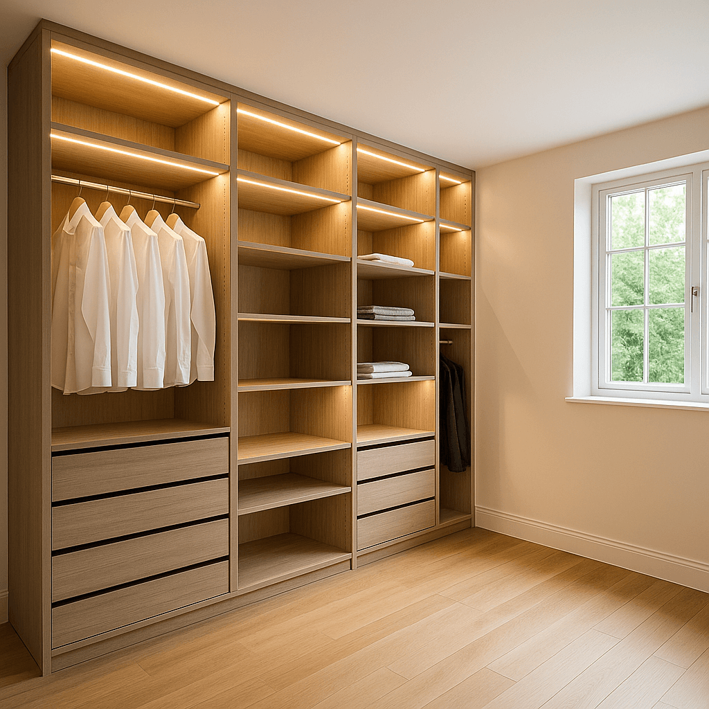 Placards, meubles intégrés, portes battantes ou coulissantes, dressings complets, penderies escamotables, tiroirs fonctionnels, intégration LED : chaque élément est pensé à la bonne dimension, avec le bon système et le bon matériau. Rien n’est laissé au hasard.